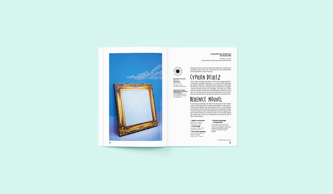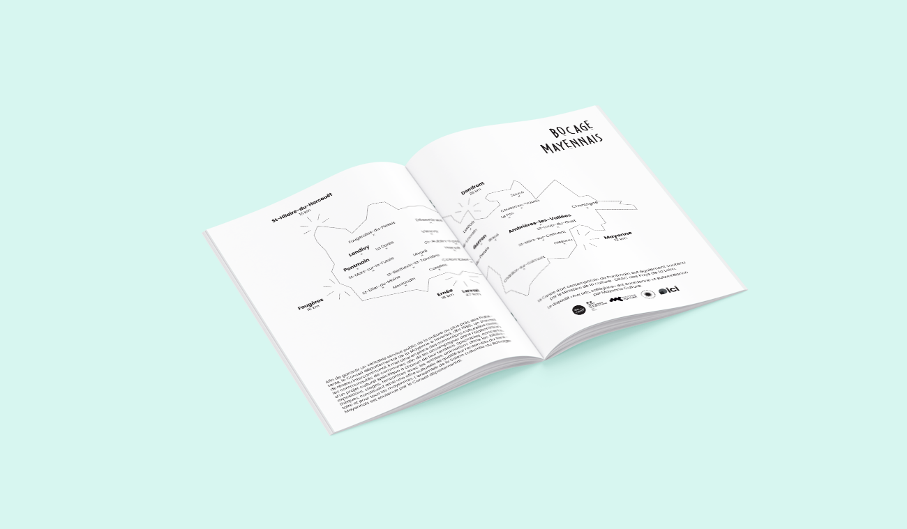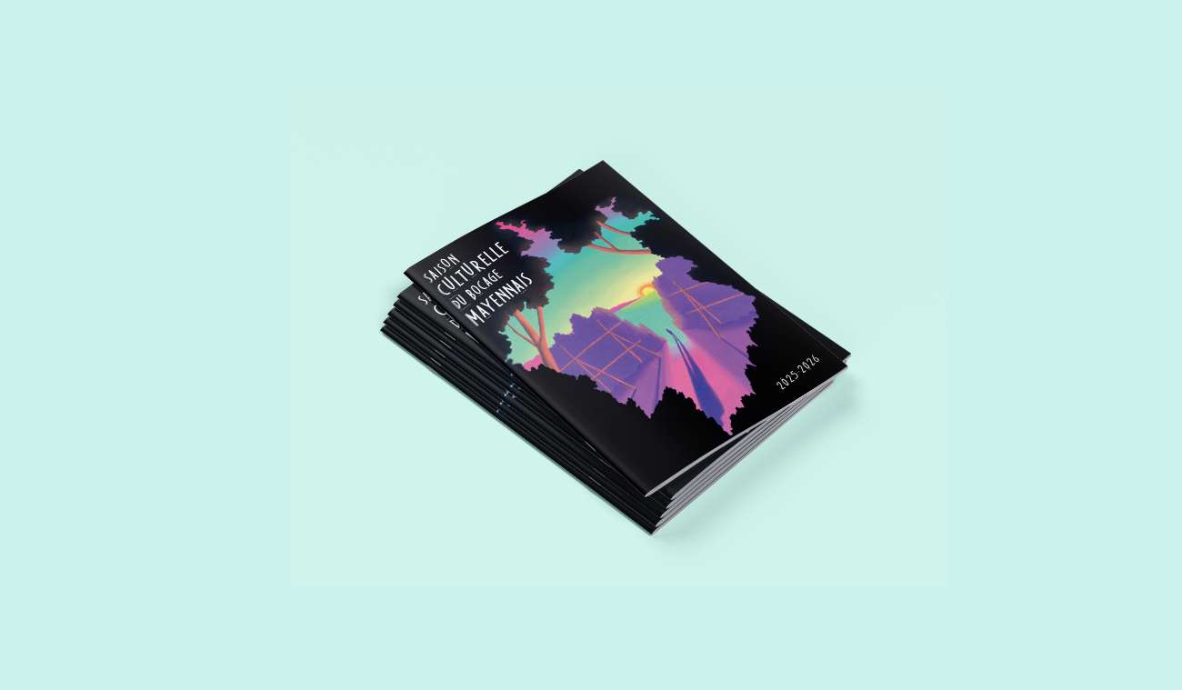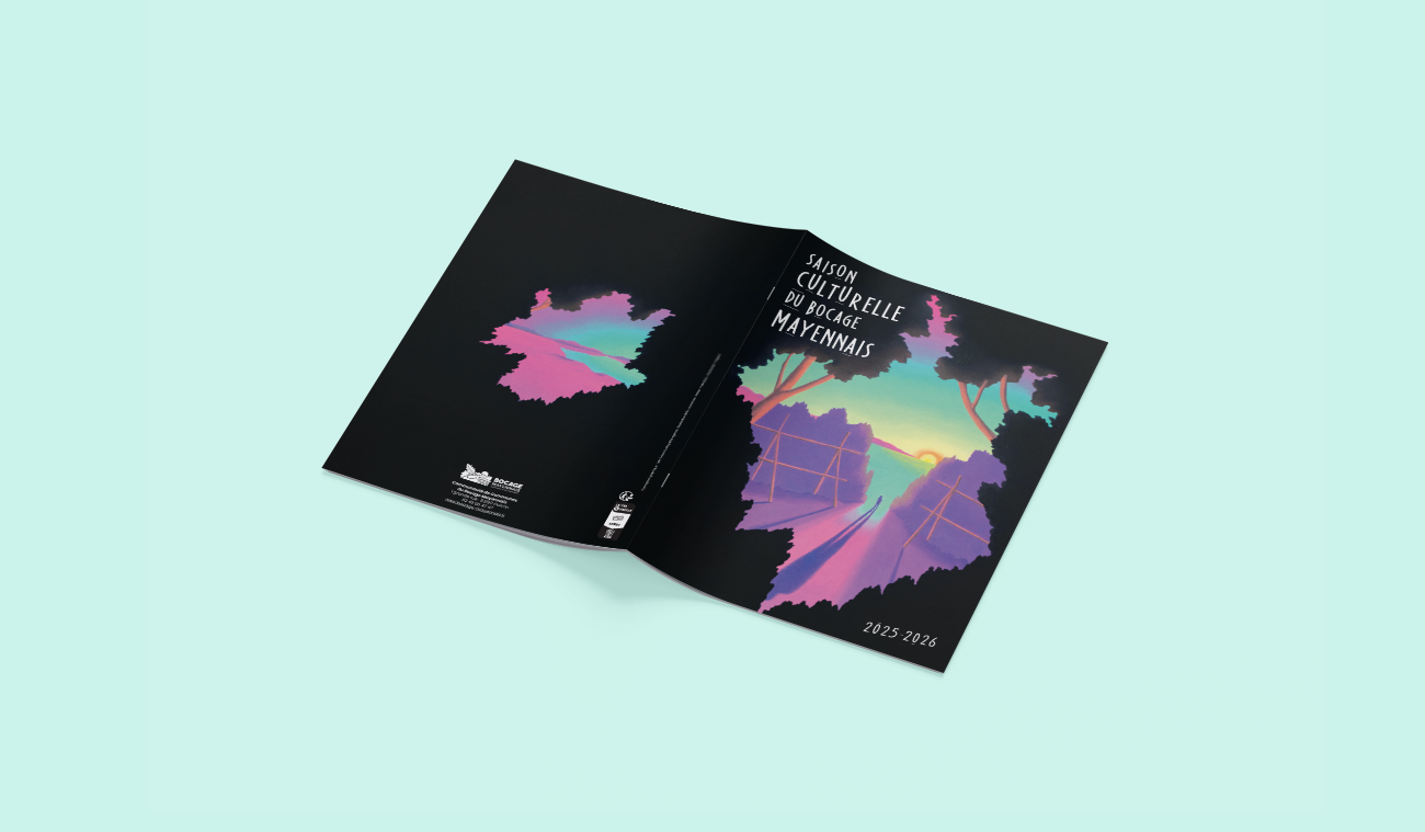Deuxième édition du livret de saison culturelle du Bocage Mayennais en partenariat avec Adrien Fricheteau pour la couverture.