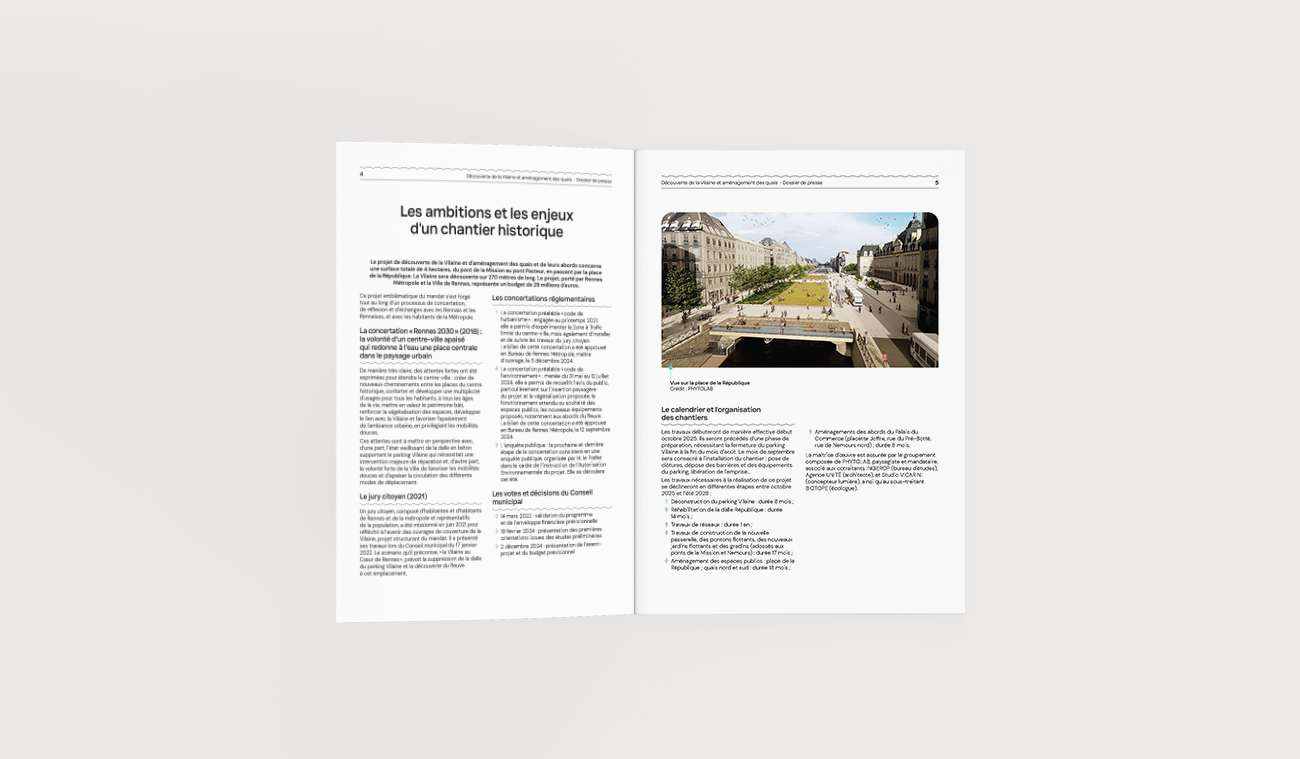 Réalisation de deux dossiers de presse de 20 pages pour la Ville de Rennes. L’un porte sur l’inauguration du Bâtiment 78 et le deuxième sur le nouvel aménagement des Quais de la Vilaine.