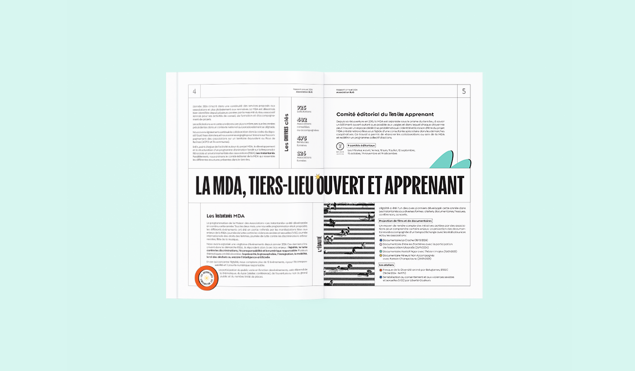Quatrième collaboration illustrative avec Minuit Studio pour le rapport annuel 2024 de l’Association Bug.